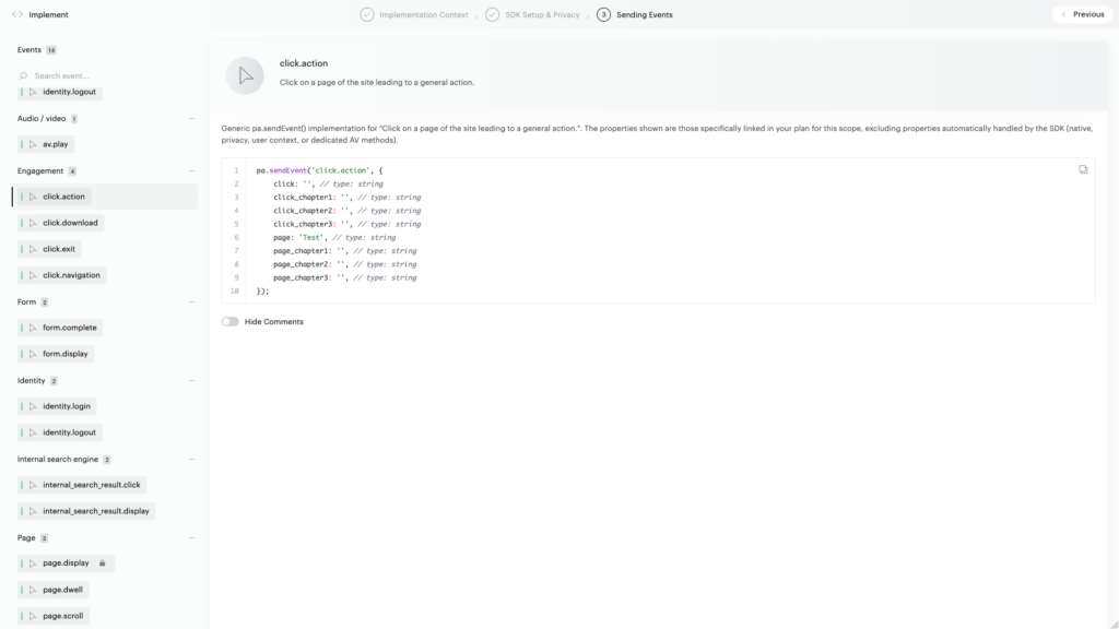 Le brief développeur est standardisé : l’une des principales sources de friction en implémentation analytique, c’est le gap entre la spec analytique et ce que le développeur comprend. Le guide généré par Implement réduit ce gap en produisant directement des snippets de code contextualisés.