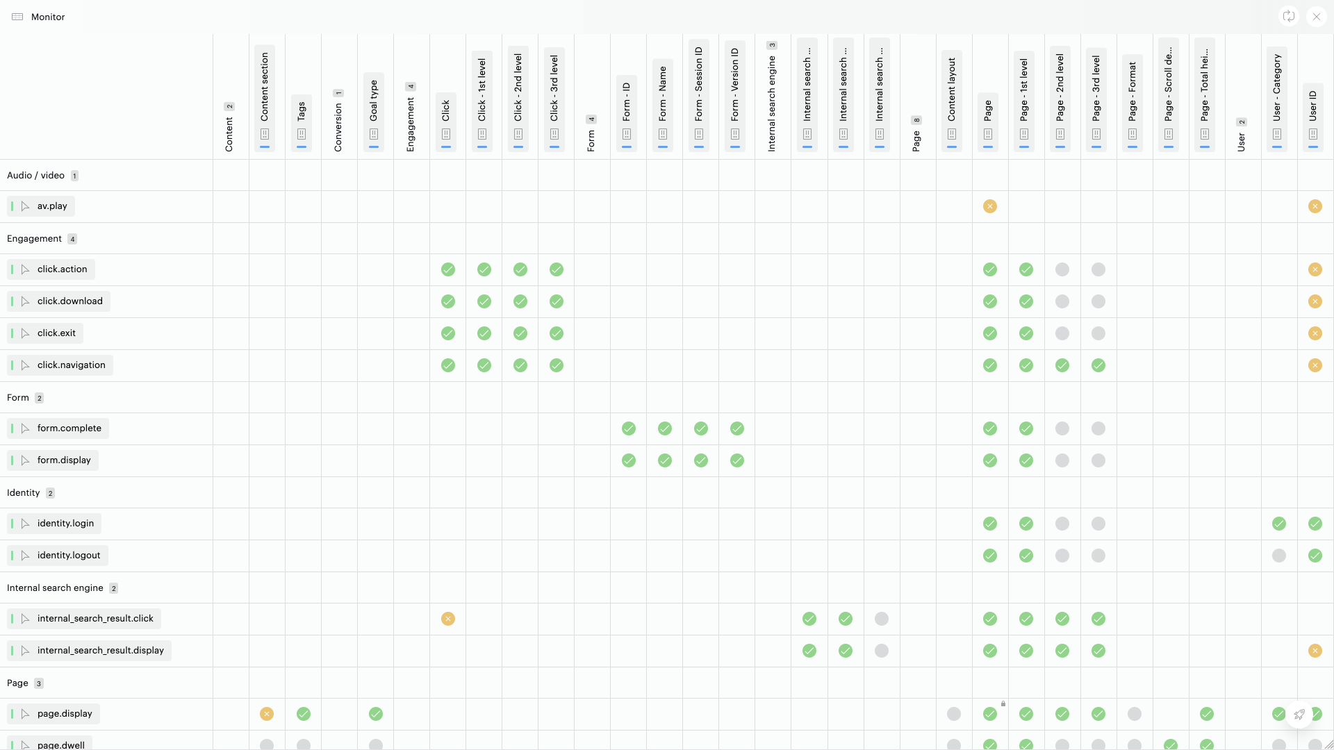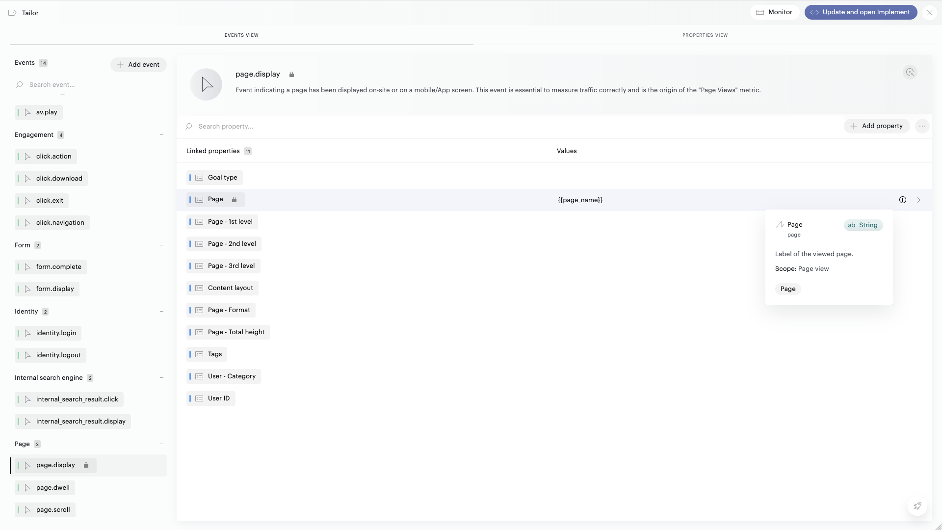 Un détail important : l’étape Tailor affiche un plan de marquage unifié qui fusionne toutes vos sources de données activées. Si vous avez activé Publishing et AV Insights, les événements et propriétés des deux sources apparaissent dans la même vue. Vous n’aurez plus à jongler entre plusieurs documents de marquage.