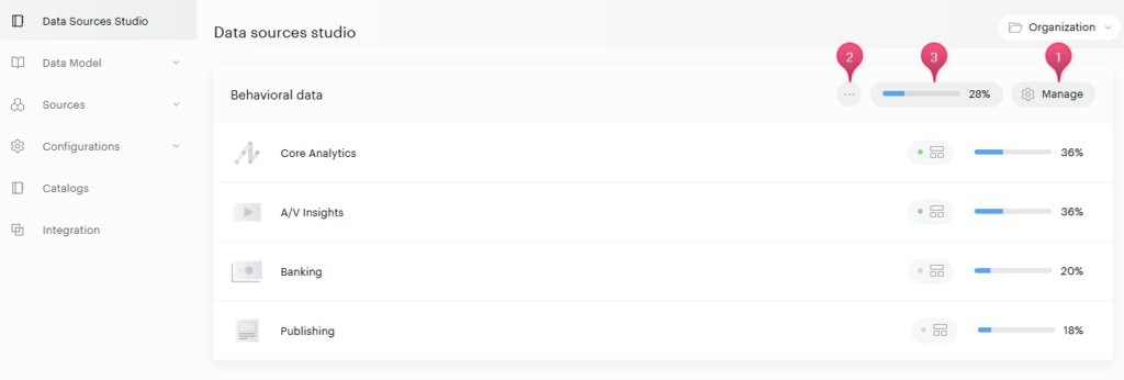 Dans la vue principale du Data Sources Studio, chaque source de données affiche deux métriques distinctes :
