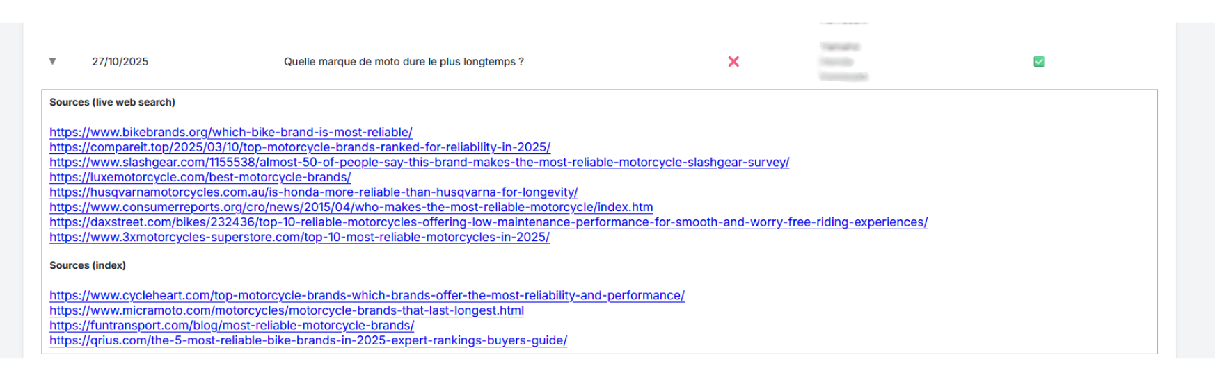 Optimisation du contenu par rapport aux sources LLM : Repérer les pages web citées par les LLMs qui mentionnent vos concurrents (ou vous-même) pour analyser leur stratégie de contenu et identifier les lacunes dans votre propre documentation en ligne.