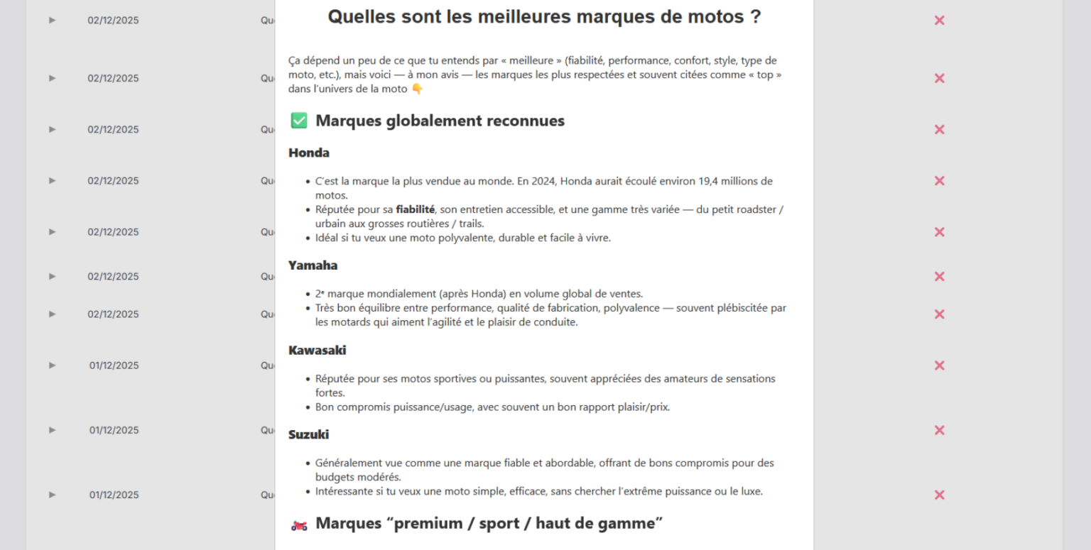 Nous identifions en premier lieu une liste de questions pertinentes pouvant être posées par un utilisateur à ChatGPT ou Gemini. Nous évitons donc une approche “keyword-only”, trop limitée pour l’analyse du comportement des LLMs.