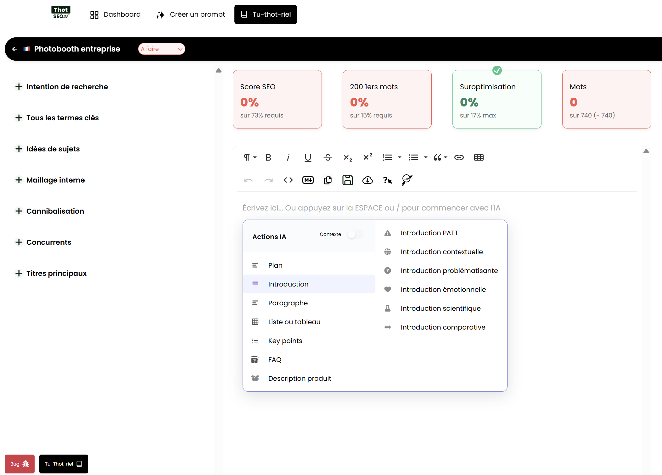 En bref, Thot SEO vous montre en un coup d’œil la cohérence de votre contenu avec les attentes de Google et vous guide pour combler les manques. Tout ce qu’il faut pour ranker sans sacrifier la qualité !