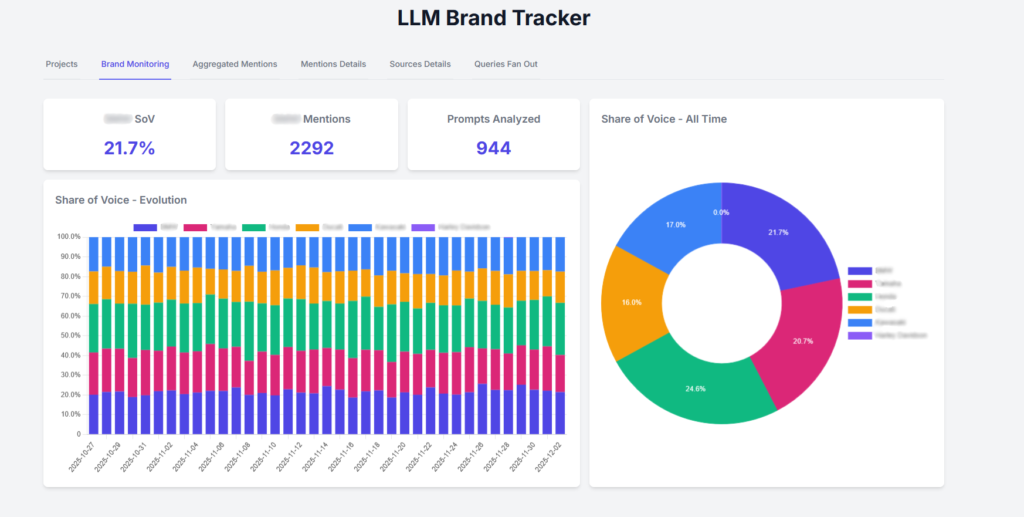 Résultat : une vision inédite et en temps réel de votre présence dans l’écosystème IA. LLM Brand Tracker vous aide ainsi à surveiller votre e-réputation, comprendre les stratégies des concurrents, optimiser vos contenus pour les modèles de langage, repérer les signaux faibles et dénicher des opportunités RP avant tout le monde.